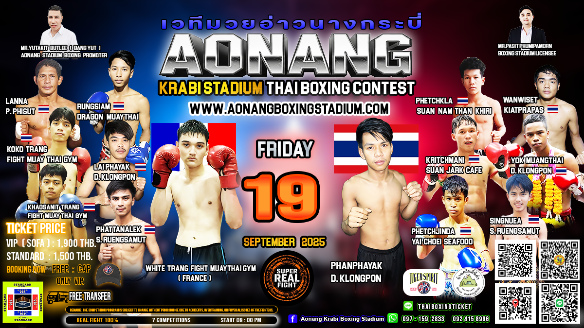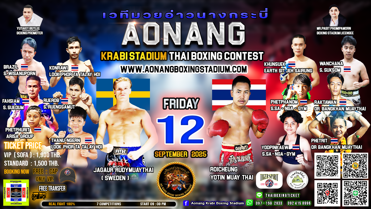 Aonang Krabi Boxing Stadium 100 Soi Nopparatthara 13 Moo 3, Ao NangFree : Cap (Only VIP) Remark: The competition program is subject to change without prior notice due to accidents, overtraining, or physical issues of the fighters.