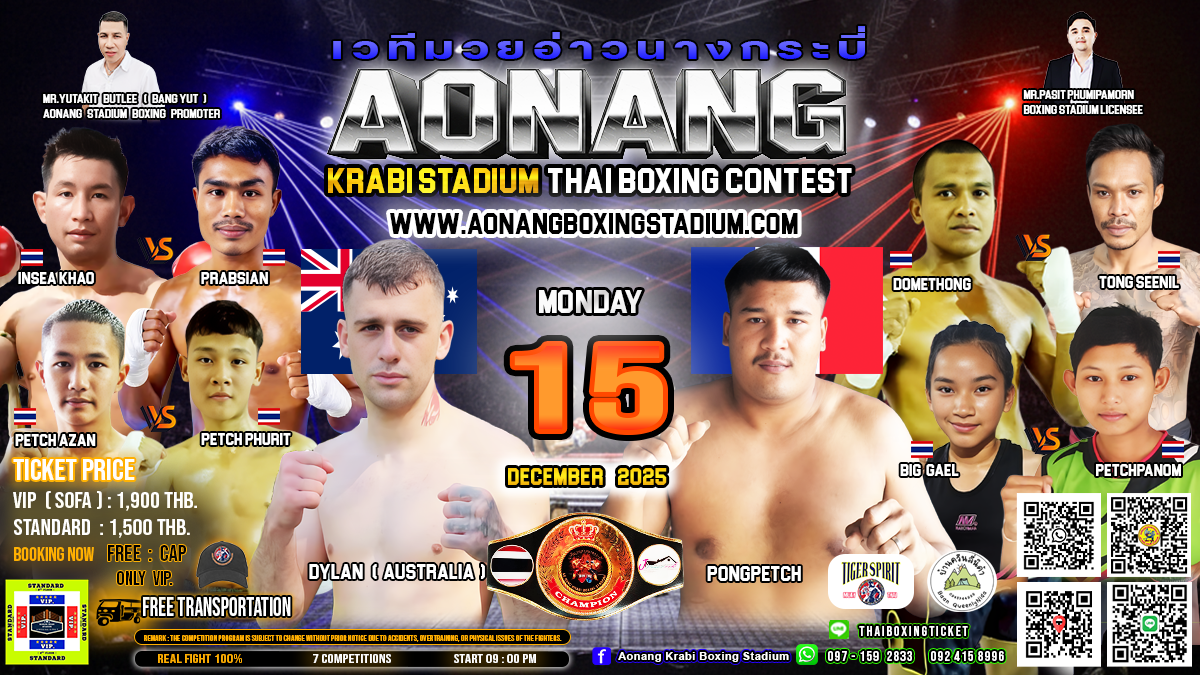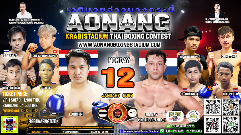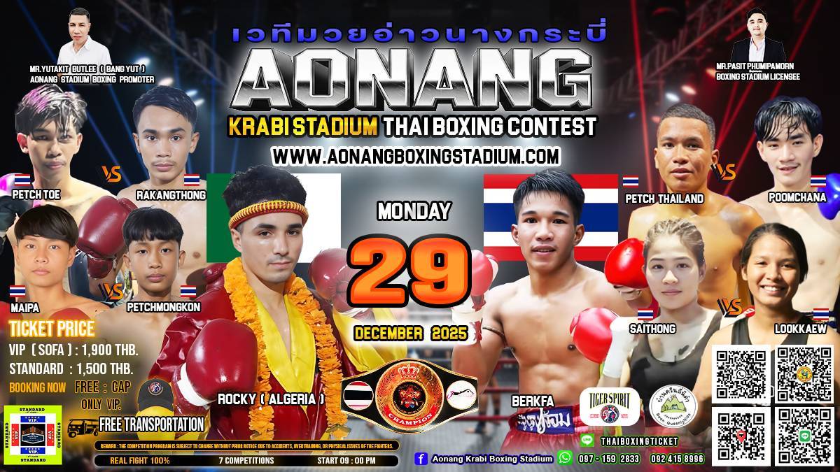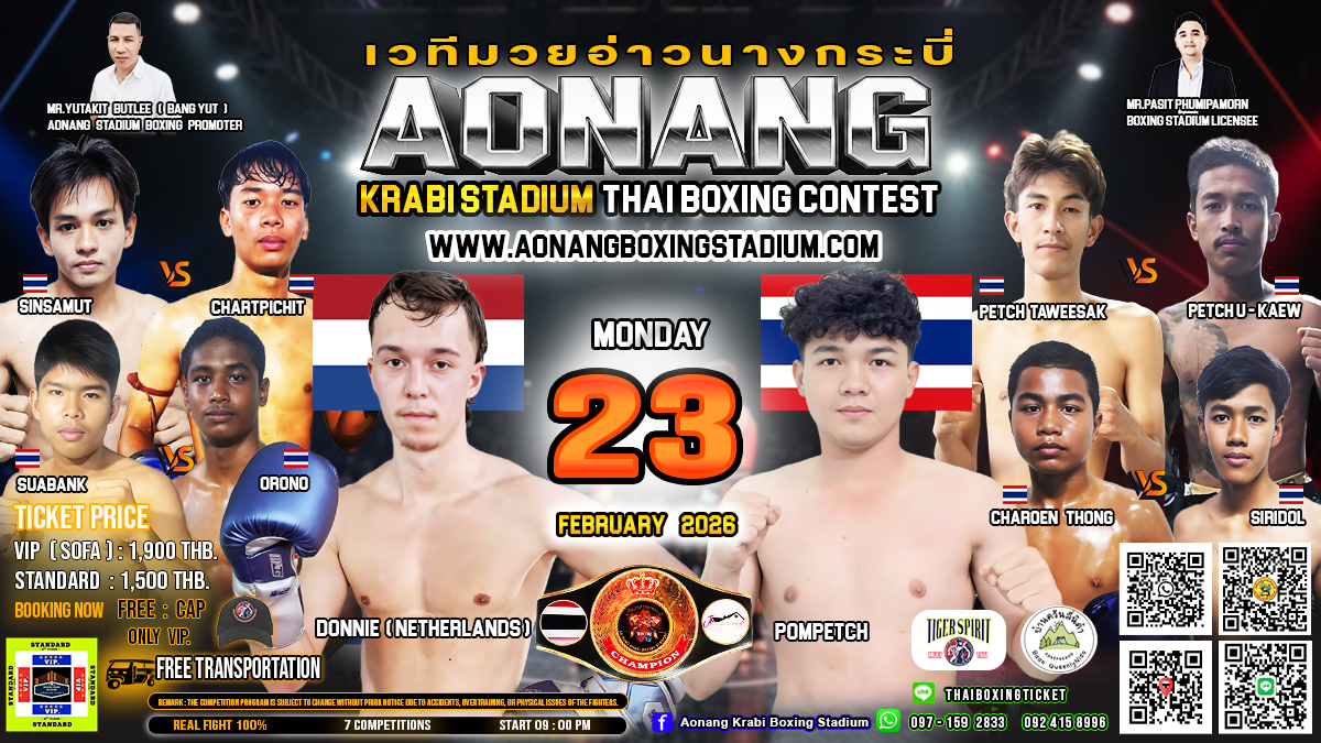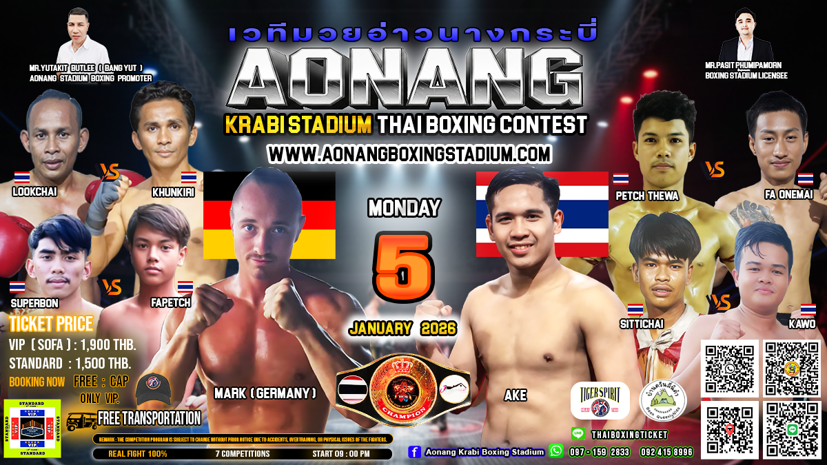Aonang Krabi Boxing Stadium 100 Soi Nopparatthara 13 Moo 3, Ao Nang, Krabi, ThailandFree : Cap (Only VIP) Remark: The competition program is subject to change without prior notice due to accidents, overtraining, or physical issues of the fighters.